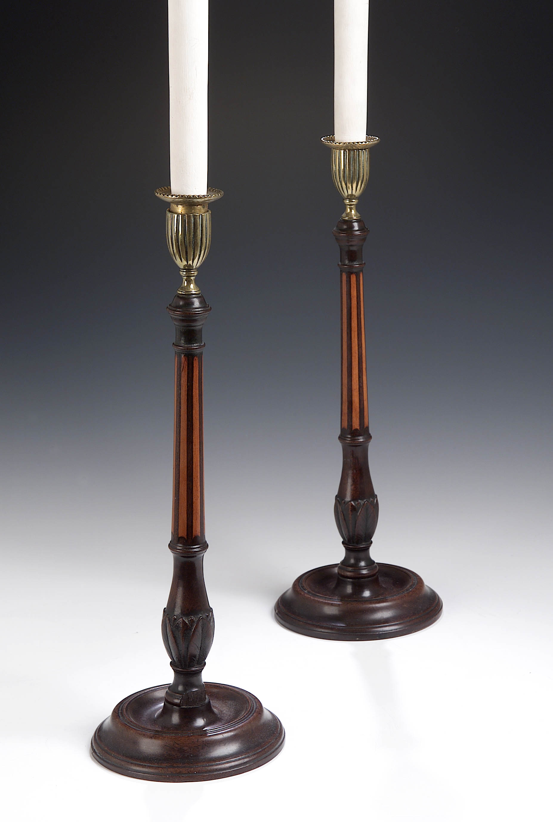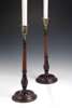 each with brass urn shaped socle on turned and later inlaid column with carved baluster lower screen, on turned base (2)