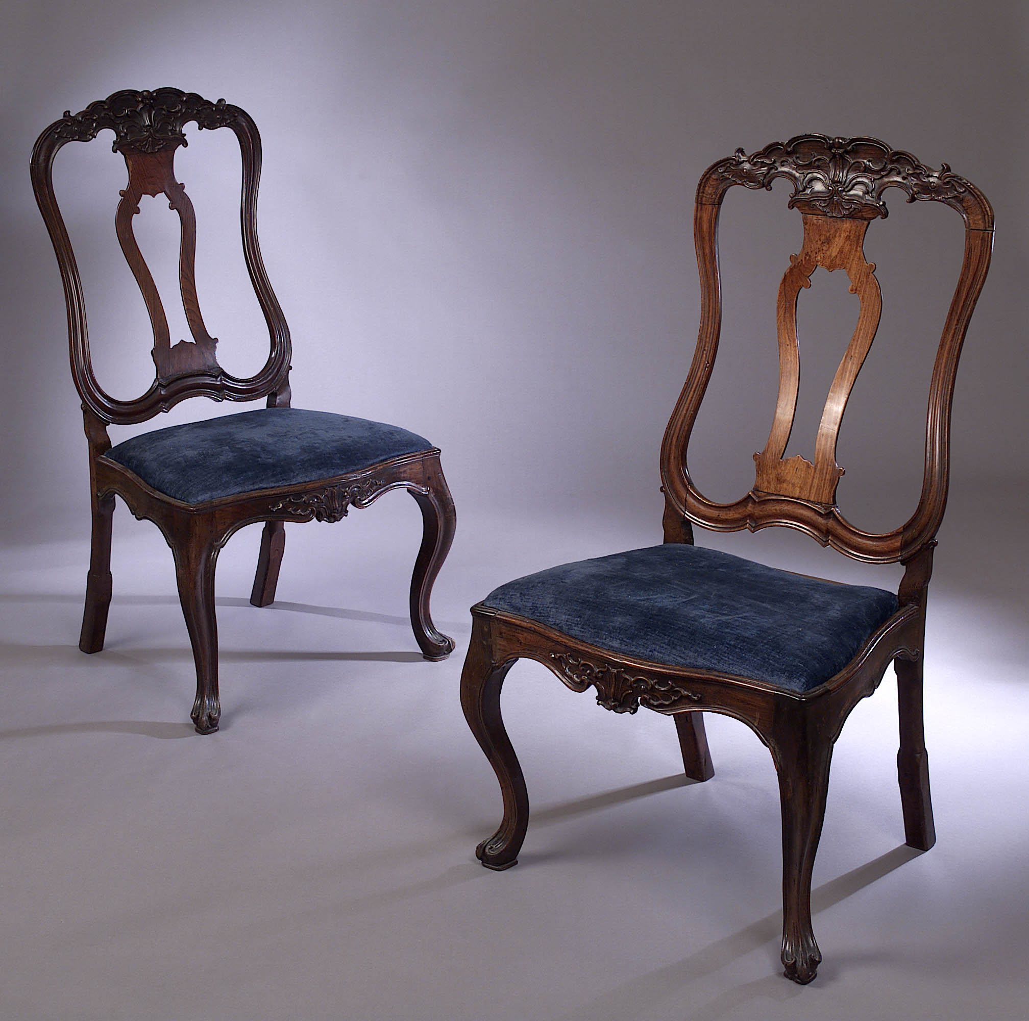 each with carved scrolled top rail above a pierced vase shaped splat, the drop in velvet upholstered seat on cabriole legs with scrolled trefoil feet (3)