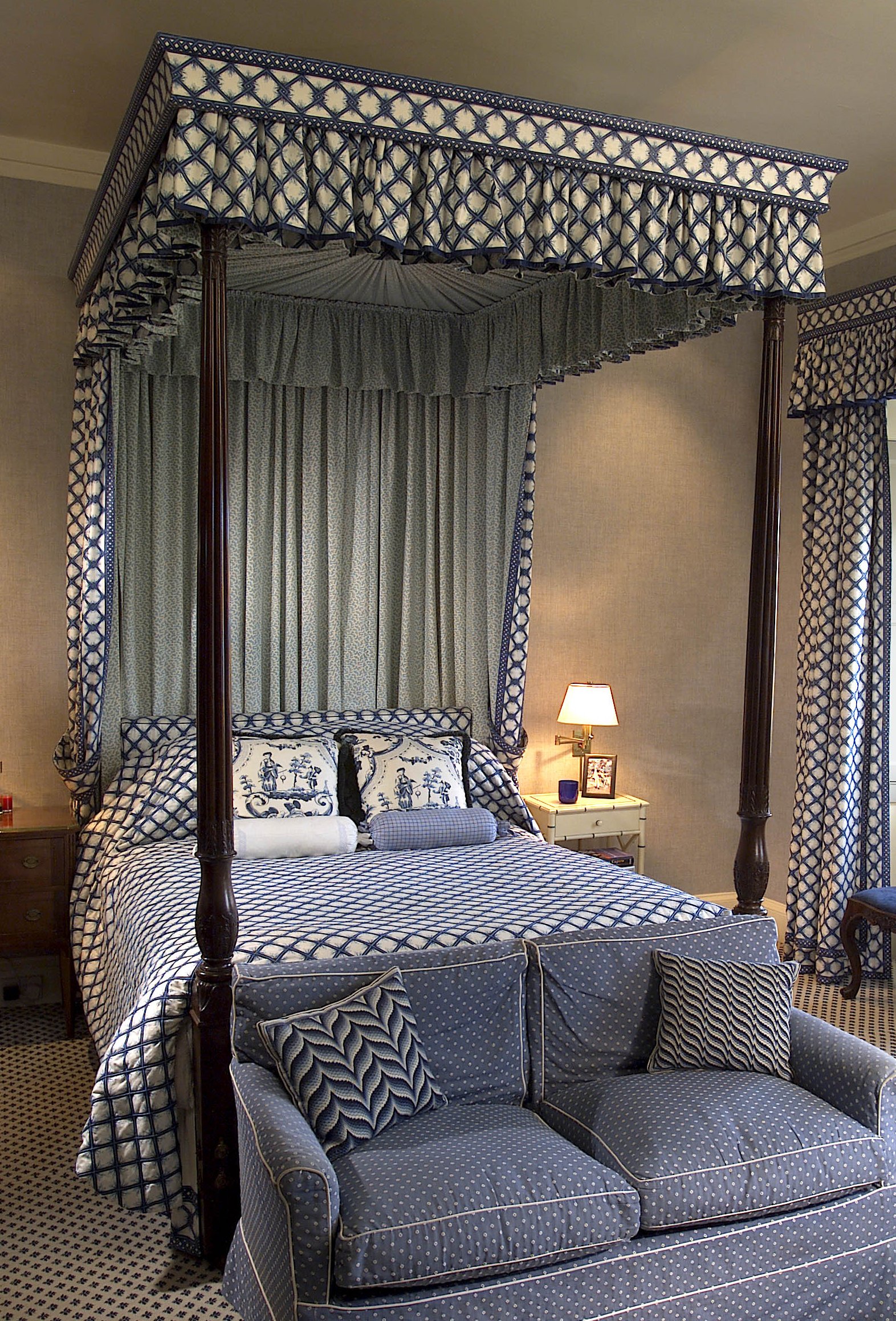 the top hangings and drapes upholstered in blue and white trellis fabric by Drysdales, Edinburgh, the two end posts of tapering reeded and baluster form, carved with acanthus and stiff leaf decoration, on block lower sections with wooden castors, made up by Whytock & Reid, Edinburgh