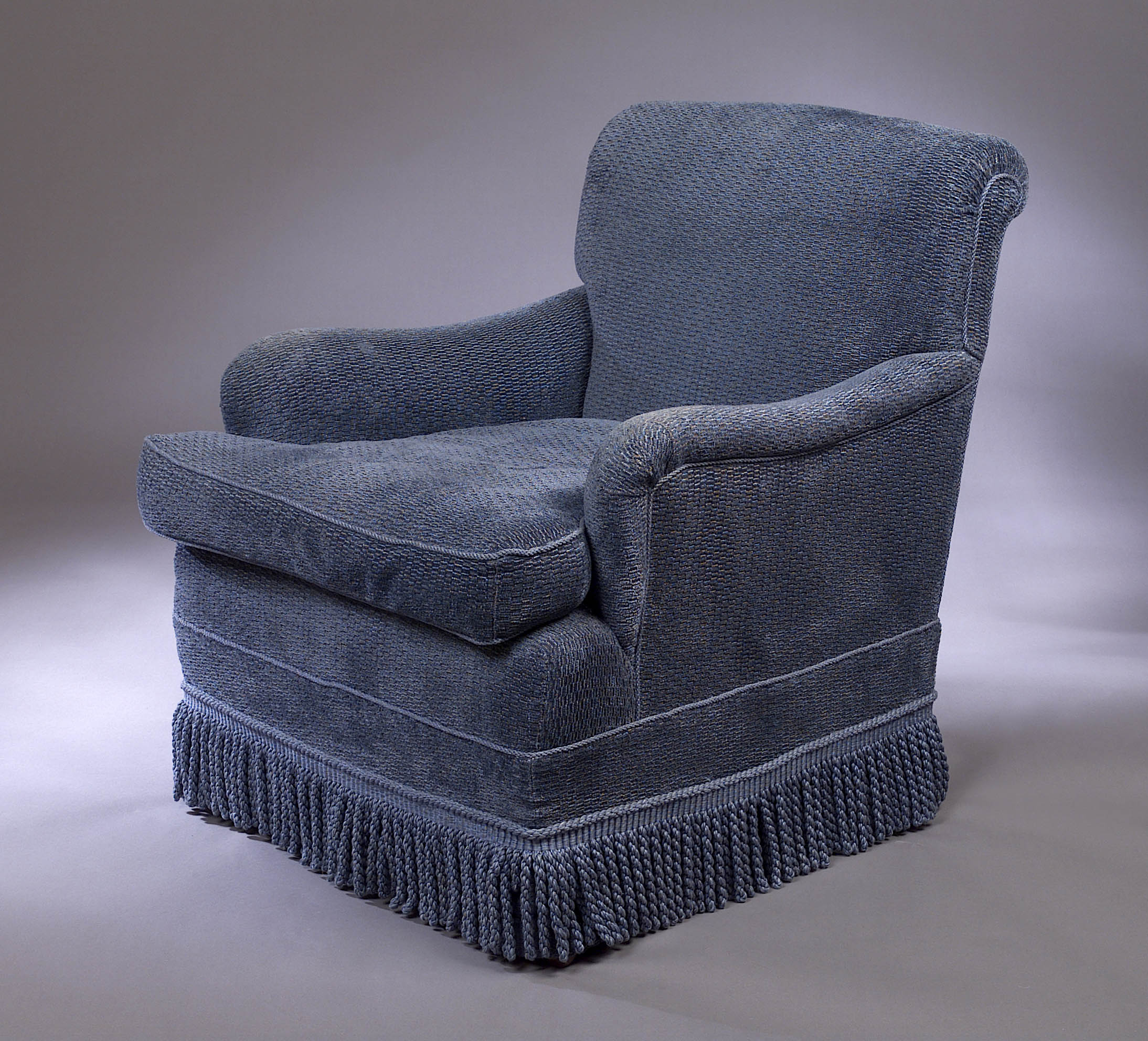 upholstered in blue chenille with bullion fringe, on square tapering mahogany legs and ceramic castors