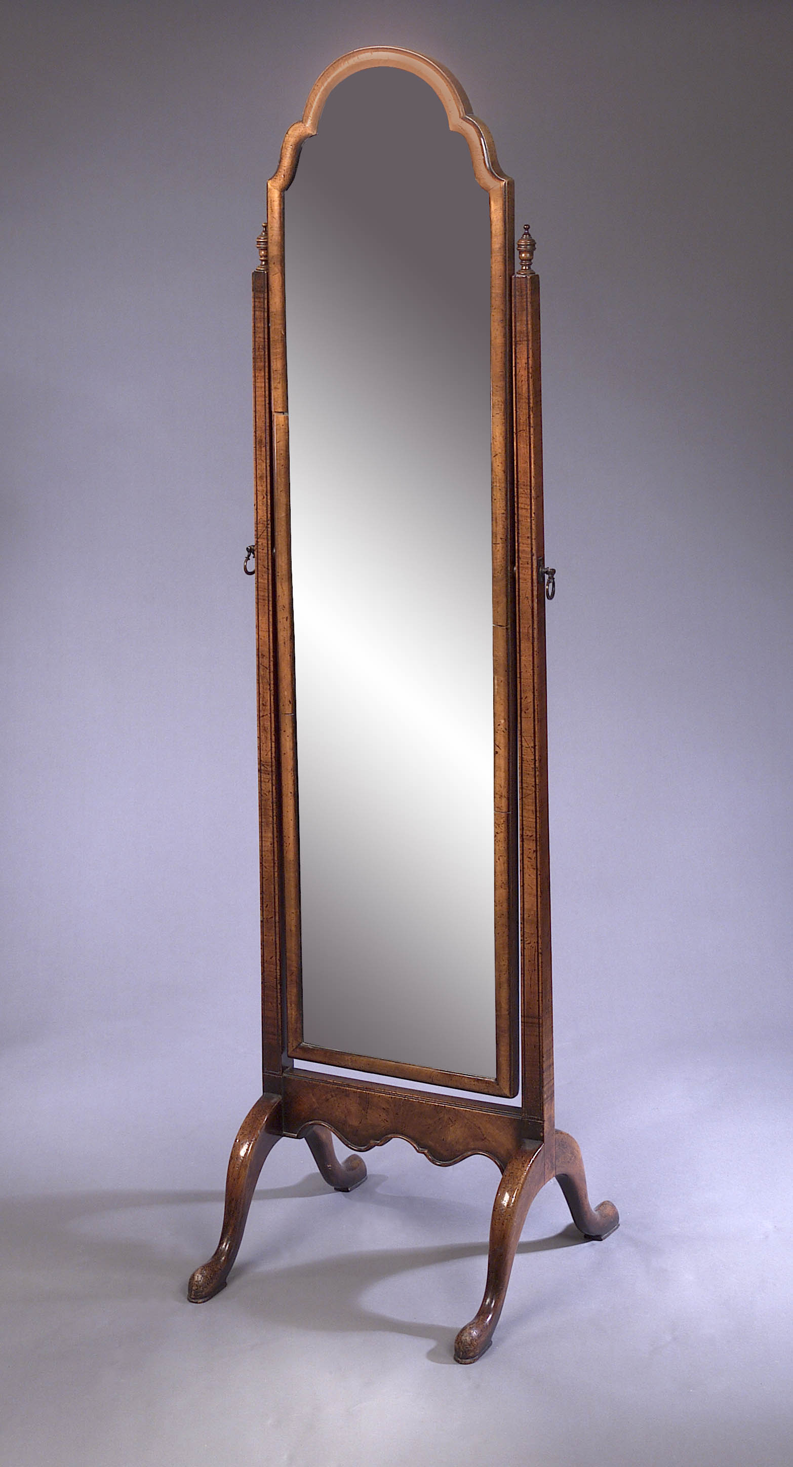the arched moulded frame enclosing a mirror plate, between two chanelled square supports with urn finials, on cabriole legs joined by a scrolled stretcher