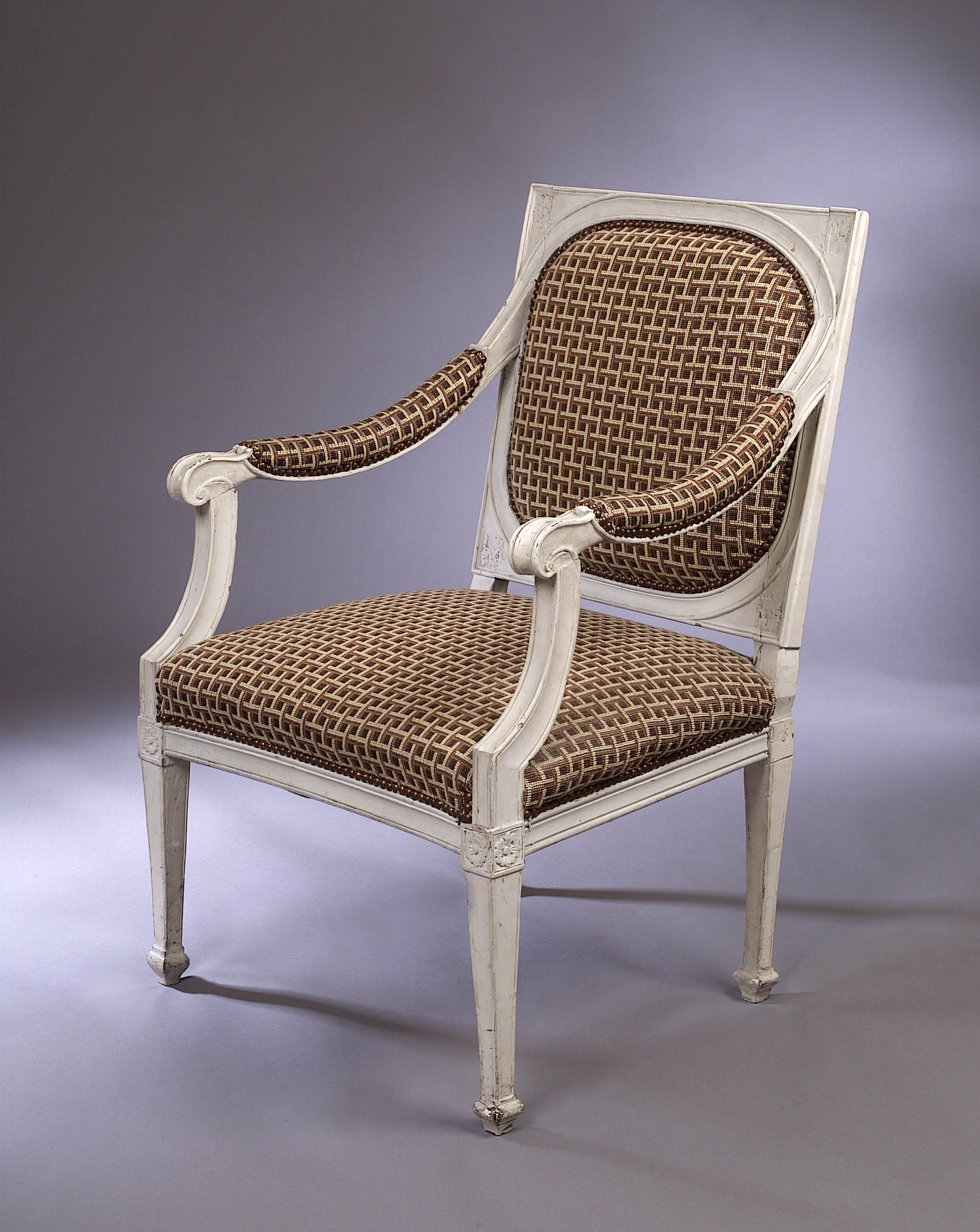 of Louis XVI style, the square back, scrolled arms and seat upholstered in brown checked fabric, on square tapering legs and spade feet