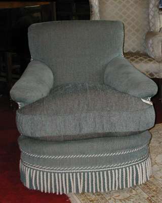 upholstered in blue Cunard chenille fabric, with blue and white bullion fringe, on mahogany cup feet with brass castors