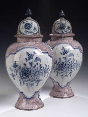 A pair of Dutch Delft manganese ground baluster vases and painted wood lids