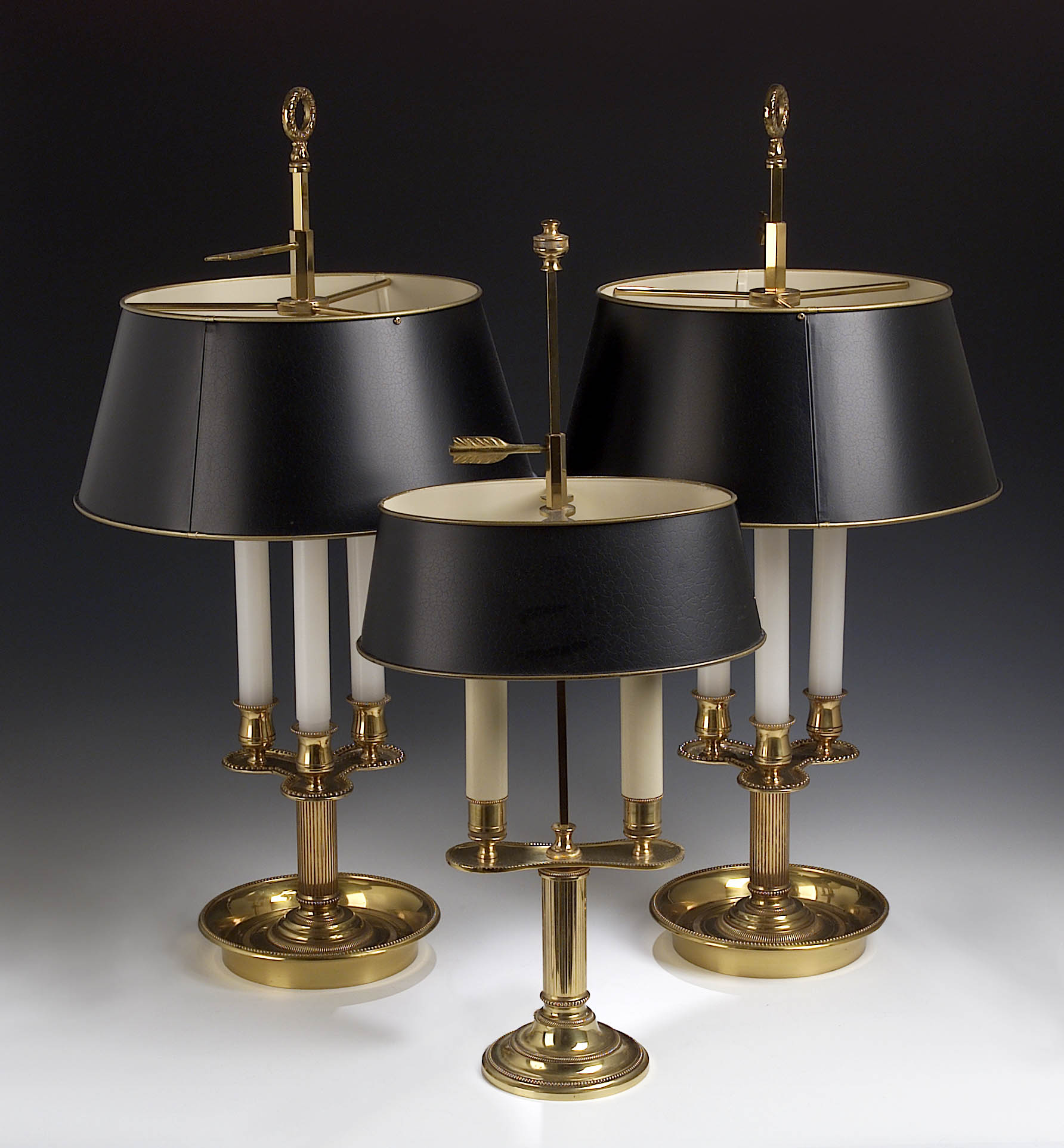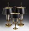 of Empire style, each with adjustable painted tole shades on wreath surmounted square column, with three socles on reeded column on circular gadrooned dished base, 65cm high; and another two branch example