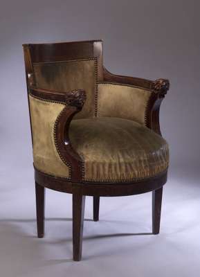 the curved toprail and arms with carved lionhead terminals, above close nailed leather upholstered back and seat, on square tapering legs