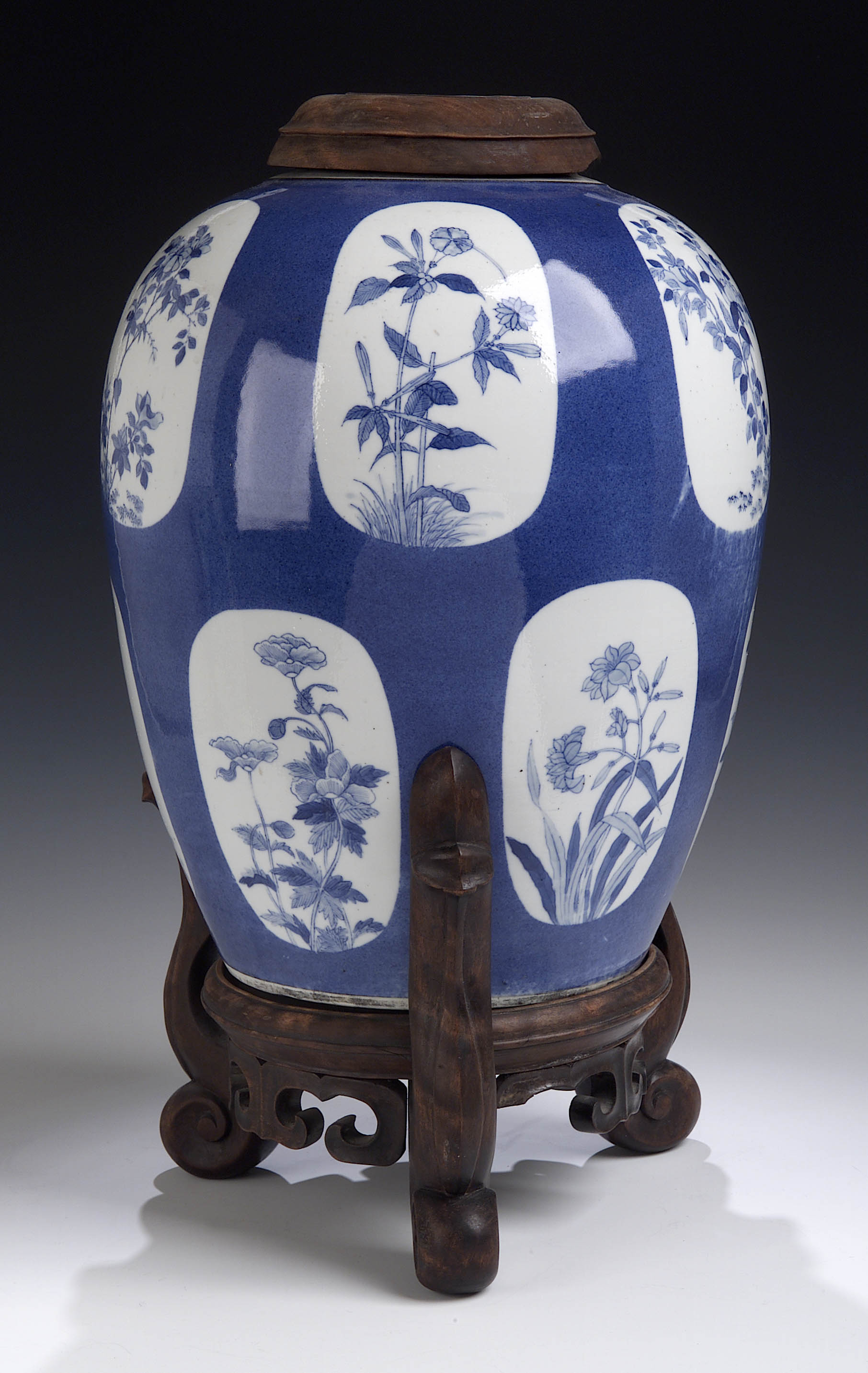 with wooden cover and stand, the powder blue ground decorated with two rows of six oval panels painted with flower branches