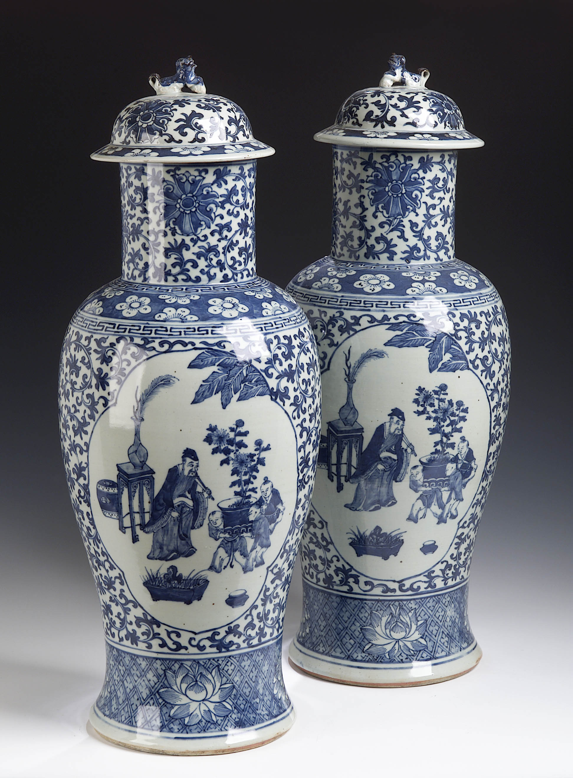 with dog of fo finial over domed lid and cylindrical neck, over body with opposed cartouche panels of figures of an elderly scholar instructing three boys to carry a plant