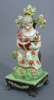 circa 1820, of Sherratt type, modelled as a young girl seated with floral bocage back, wearing a floral sprig dress and reading, on a square table base with floral swags, bracket feet