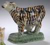 circa 1800, naturalistically modelled as a cow with blue, brown and yellow painted decoration, with attendant milk maid, on canted crisply cast plinth