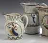 circa 1800, the oviform body moulded in relief with opposed female figures, one depicting 'Plenty', glazed in blue, yellow and brown, between bands of stiff leaves, 12.5cm high; another similar, larger, with a continuous central frieze of two men with rifles and hounds, 16cm high (2)