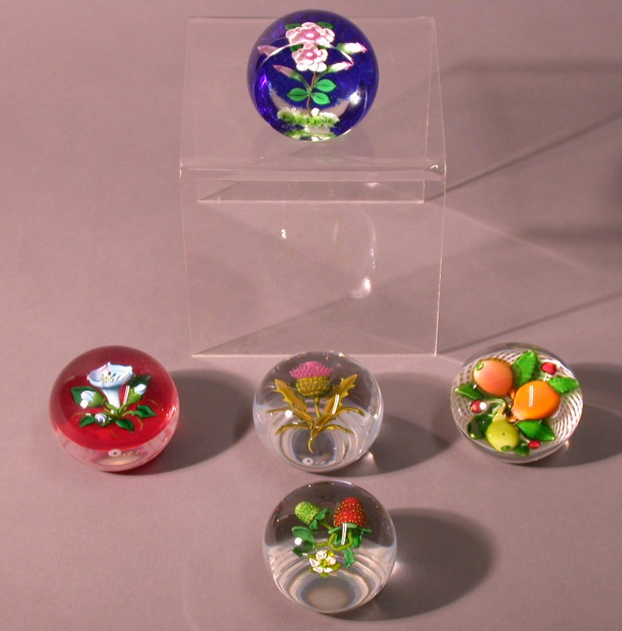 with original box 'Diana, England's Rose' insribed to base and numbered 76/3000. another four fruit and flower decorated paperweights