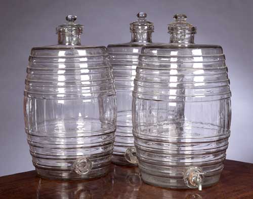 the horizontally ribbed bodies with glass funnels and lids and metal taps (one tap lacking) (3)