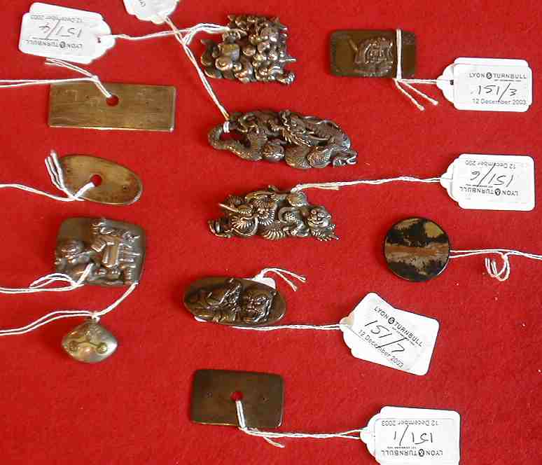 including in silver, a dragon and the flaming pearl, a tiger and a snake fighting, a shi-shi, three plaques with backing plates, one killing a tiger, another with a figure reading a scroll, another carving a mask and four other back plates (11)