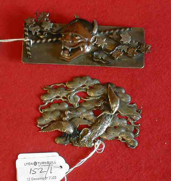 including a Kozuka with inlaid mask and hammer, three Menuki (pair and one), five other bronze mounts of varying sizes, subjects include a parasol, two shi-shi, two tigers fighting and two larger mounts of the tiger being slain, all highlighted in gold, various sizes