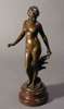 standing naked in contraposto pose by a tree stump, a dragonfly at her feet, on rouge marble base, brown patination