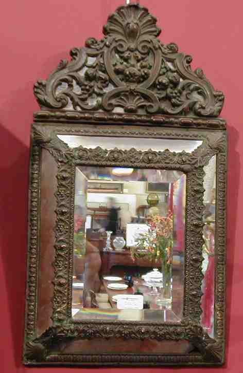 with arched scroll and fruit decorated pediment over main bevel glazed rectangular plate and four subsidiary plates