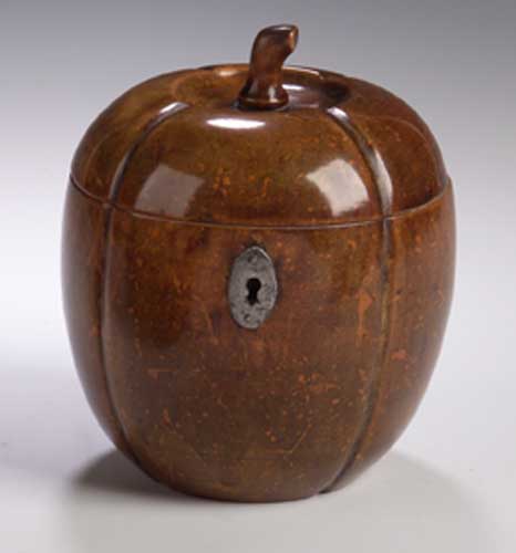 in the form of a melon, the lobed body with stalk and green tinged patination, oval escutcheon