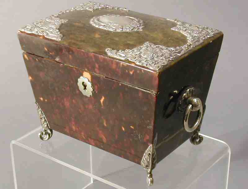 with leaf cast pierced scrolling mounts, the rectangular hinged lid enclosing interior with tortoiseshell lid above tapering body with scroll feet