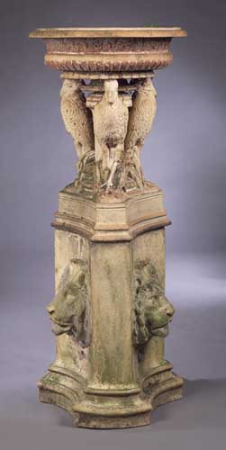 the moulded circular bowl raised on pedestal and three herons with concave triform plinth, on corresponding pedestal with lion's masks and cavetto moulded plinth