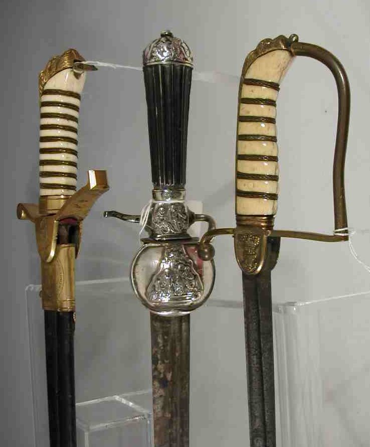 the ivory grip bound with a double twist of brass wire, gilt brass hilt with lion head pommel, the langets with crowned anchor, single edge narrow 26" blade, a damaged stirrup hilted naval sword with gilt brass hilt, the ivory grip bound with a double twist of brass wire, the hilt damaged and missing the knuckle guard, the blade rusted into brass mounted leather scabbard, a damaged silver hilted hunting hanger sword, the mounts decorated in relief with classical scenes the grip of fluted tapering ebony, the knuckle guard missing, single edge blade with two long fullers, missing scabbard