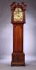 the twin train movement with anchor escapement striking on a bell, the arched brass dial with silvered chapter ring, subsidiary seconds dial and date aperture, the hood with swan neck pediment and fluted columns, arched trunk door, base with shaped apron and bracket feet
