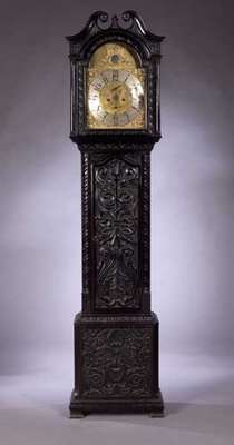 the twin train movement with anchor escapement striking on a bell, the arched brass dial with cast spandrels and silvered chapter ring, subsidiary second and date dials, the swan neck pediment above hood with columns, shaped trunk door flanked by spiralling reeded columns, base with ogee feet, profusely relief carved allover