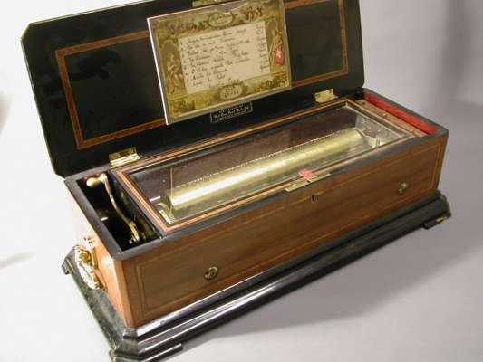 by Nicole Freres, Geneve, the 13" cylinder playing eight airs, No. 2867/45024, the case with canted angles, rosewood and satinwood cross banding and ebonised mouldings, cast handles to the sides, the hinged lid centred by Prince of Wales feathers
