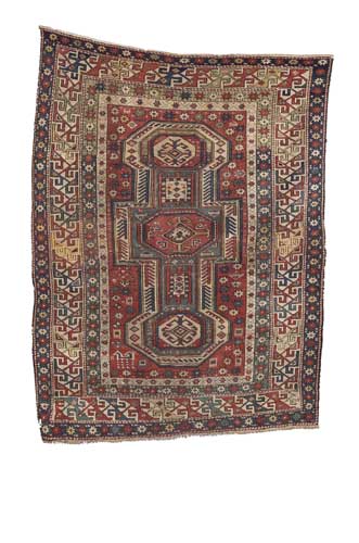 the red field with large lobed polychrome medallion, within ivory hooked border between blue and ivory bands