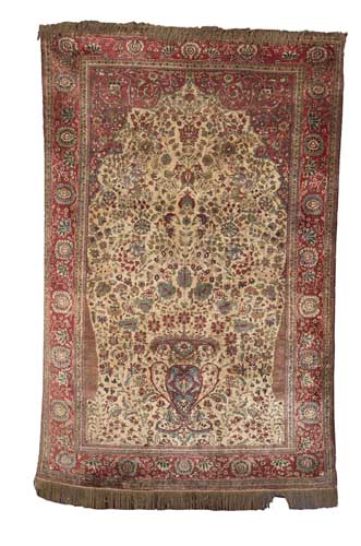 the cream field with blue vase issuing palmettes and scrolling foliate vines, claret spandrels, within claret palmette and scrolling vine border between bands (refringed)