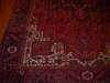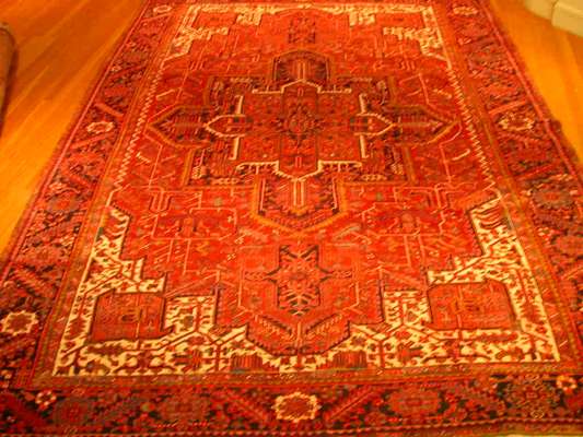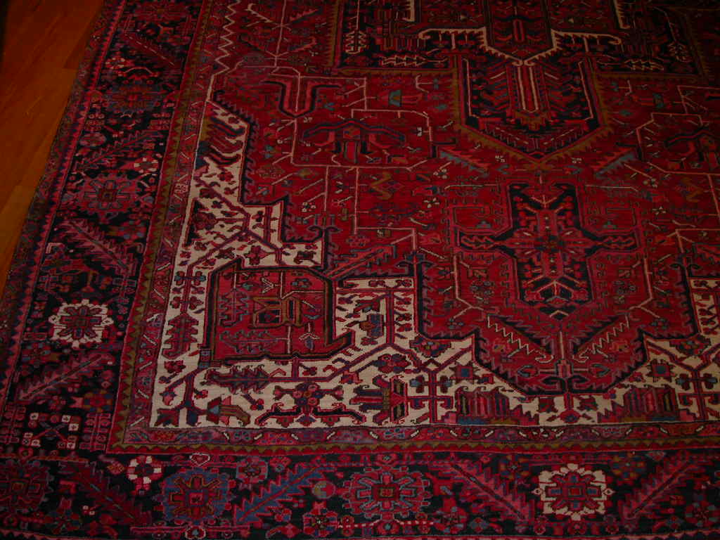 the brick red field with large central indigo and rose medallion suspending pendants, ivory spandrels, within indigo rosette and serrated leaf border between bands
