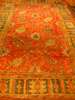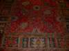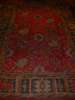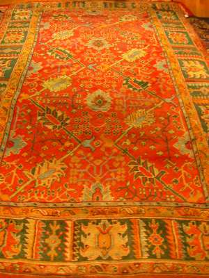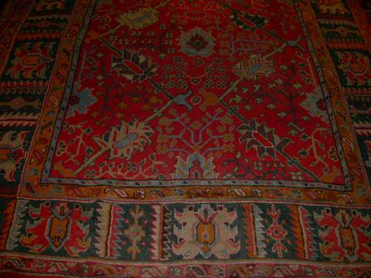the red field with overall pattern of palmettes and angular floral vine, within bottle green palmette and serrated leaf border between ochre and red bands