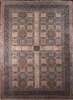 the cruciform field with central foliate roundel and fifteen rectangular tree and vase panels to each quarter, within indigo scrolling floral vine border between palmette bands