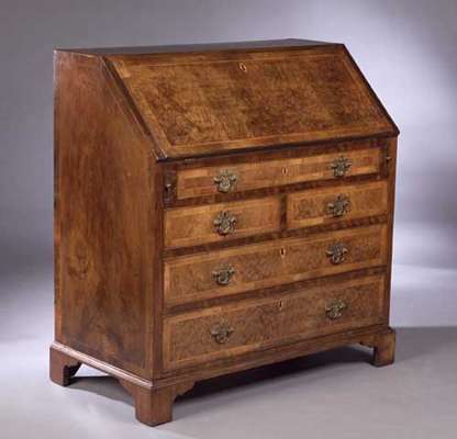 with crossbanding and chequer stringing, the fall front enclosing burr walnut veneered interior with cupboard flanked by pigeonholes and drawers, above two short and three long drawer with lopers, on bracket feet