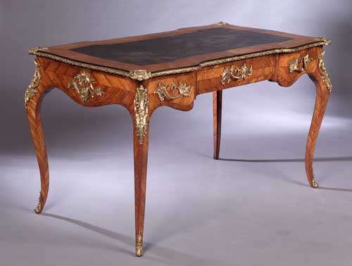 with gilt brass mounts and marquetry decoration, the serpentine rectangular top with inset leather skiver above frieze drawers and square section cabriole legs with sabots