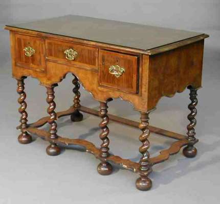 the rectangular burr walnut veneered and crossbanded top with moulded edge above central drawer flanked by deeper drawers, shaped apron and six barley twist legs joined by shaped flat stretcher, bun feet (incorporates earlier elements)