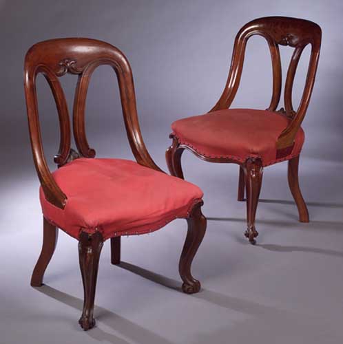 each with open moulded back centred by pierced scrolled splat, stuffover seat and cabriole front legs with scroll toes and castors (5)