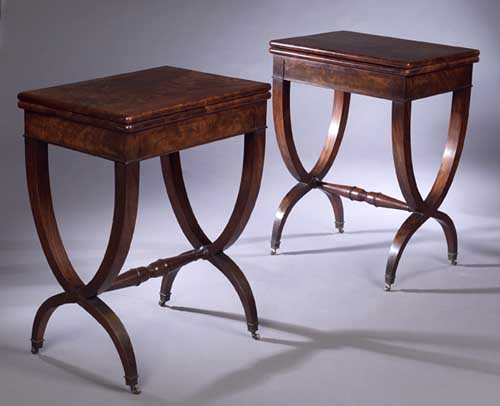 attributed to James Newton, each with rectangular swivelling foldover top with applied rounded edge enclosing quarter veneered interior inset with blue baize oval and raised moulded edge, above plain cockbeaded frieze drawer and curved square section tapering X frame supports with brass caps and castors joined by turned stretcher