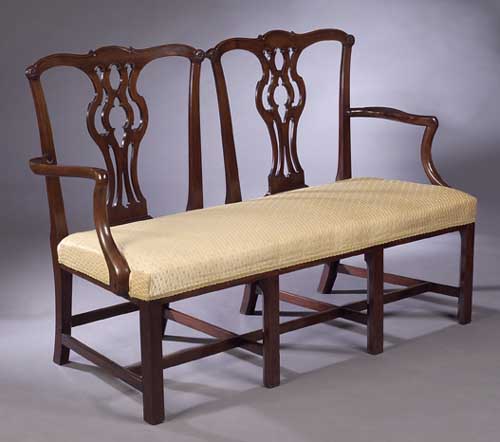the C and S scrolled top rail above two pierced vase splats and stuffover seat on chamfered square section legs joined by stretchers, with open outscrolled arms