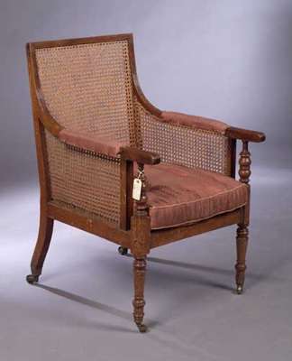 the moulded square back and downswept arms with projecting terminals on turned supports and front legs with brass caps and castors