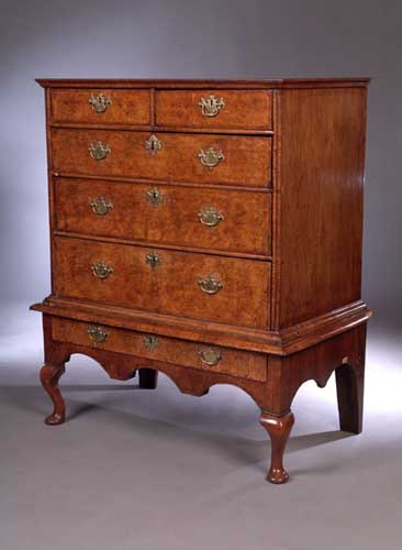 A Queen Anne walnut and burr walnut veneered chest on stand