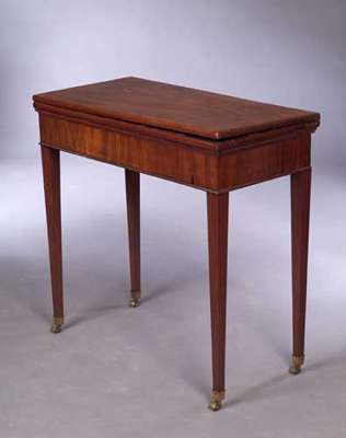 the rectangular top above single frieze drawer to one end and fluted square section tapering legs with brass caps and casters inlaid with chequer and backgammon boards