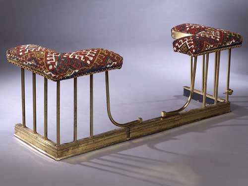 the stuffover L-shaped seats upholstered with Caucasian style woolwork, raised on plain column supports with moulded base