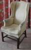of narrow proportions, the upholstered shaped back and outscrolled arms above serpentine seat with fitted squab, on carved and moulded square section front legs joined by H-stretcher