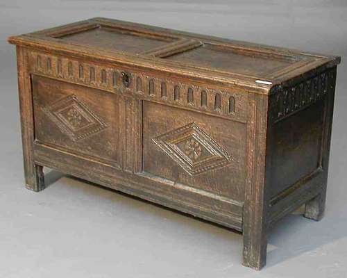 the hinged two panel lid above arcaded frieze and lozenge carved panels