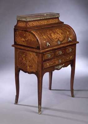 inlaid with floral marquetry decoration, with gilt brass mounts, the quarter veneered cylinder bureau inlaid with harp to central panel flanked by ribbon tied floral sprays, enclosing interior with drawers and open shelves above leather inset writing slide, surmounted by pagoda top with guilloche frieze and marble top with pierced balustraded and festooned brass gallery, above three short drawers and one long drawer, shaped apron and shaped square section tapering legs with sabots