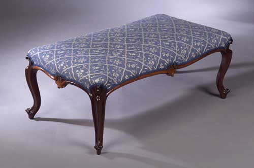 the rectangular stuffover top above moulded rail and cabriole legs with scroll toes