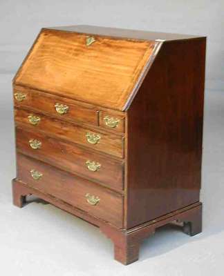 the fall front enclosing finely fitted interior with drawers, pigeon holes and central mirror door cupboard with secret compartments, above three short and three long graduated drawers, on shaped bracket feet