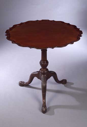 the shaped circular top with pie-crust edge, raised on bird cage and turned pedestal with spirally fluted knop, leaf carved cabriole legs with bass and claw feet
