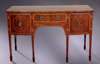 with satinwood crossbanding and boxwood stringing, the shaped retangular top above central frieze drawer and kneehole flanked by deeper drawers, one with lift out tray, on square section tapering legs with spade feet and inlaid fan medallions